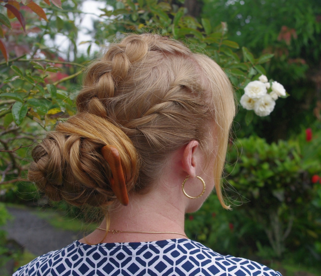 Today I decided on a boho look and made a loose center Dutch braid. Then I added lace rope braids on either side, and finished my look with a big low bun. I held my bun in place with a clip hidden inside, and my favorite large wooden Grah-toe hair fork. Thanks for coming by to see my new pictures!